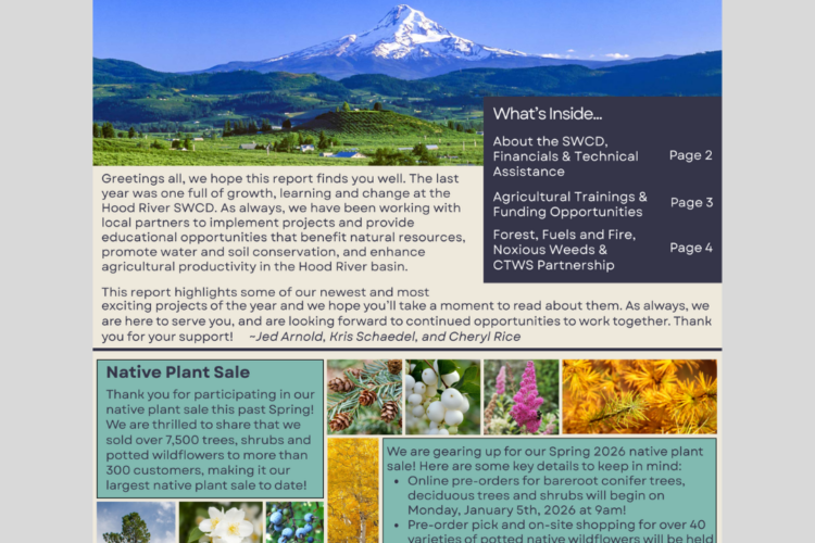 Explore our freshly designed and digital 2024/2025 Hood River Soil & Water Conservation Annual Report! Throughout the past year, we have broadened our agricultural trainings, implemented numerous upgrades to on-farm irrigation systems, initiated various water and soil conservation projects, expanded...